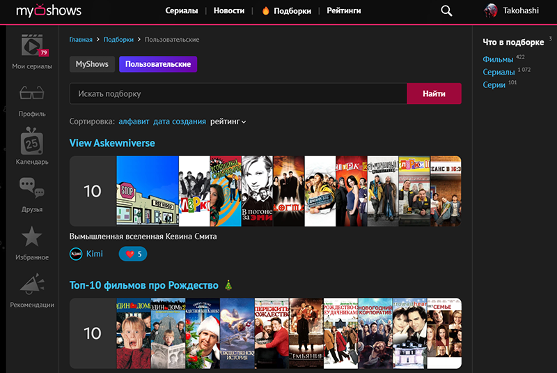 По умолчанию отображаются подборки MyShows, но при нажатии на кнопку Пользовательские вы попадете на страницу списков, которые составляют сами пользователи.