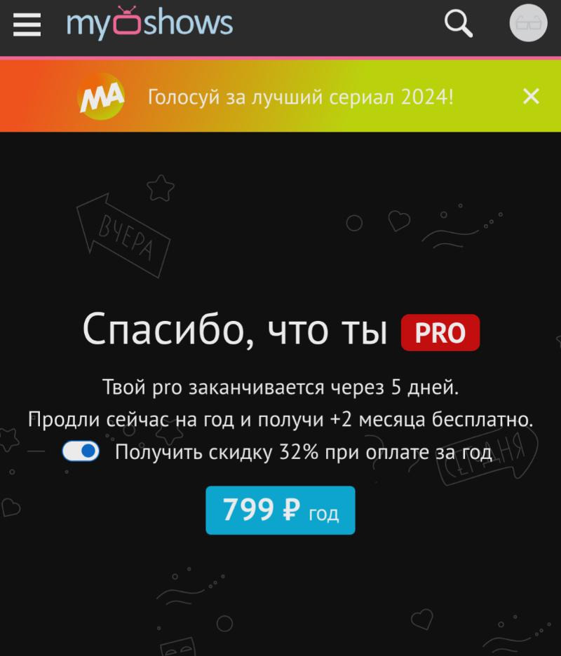 Все участники голосования получат 7 дней бесплатной Pro-подписки на MyShows. Бесплатная Pro-подписка придет вам в личный кабинет в течении суток после голосования как подарок от пользователя MyShows. Для активации вам нужно принять ее или отклонить на странице профиля.