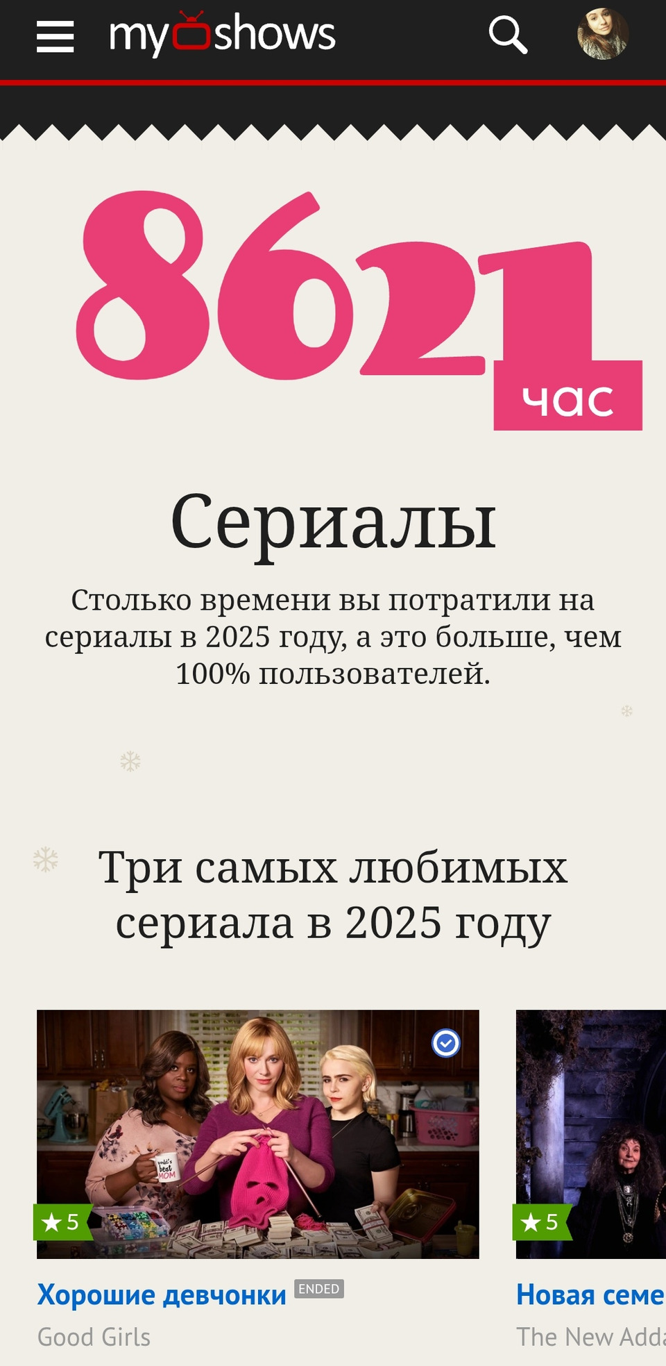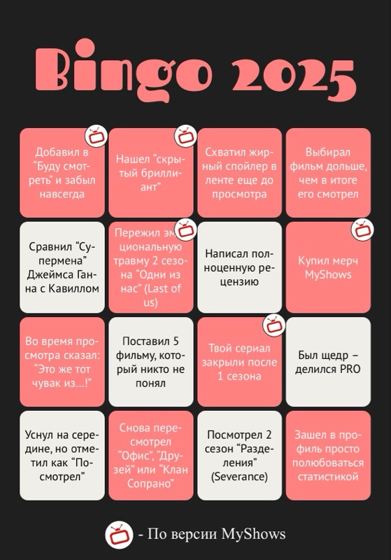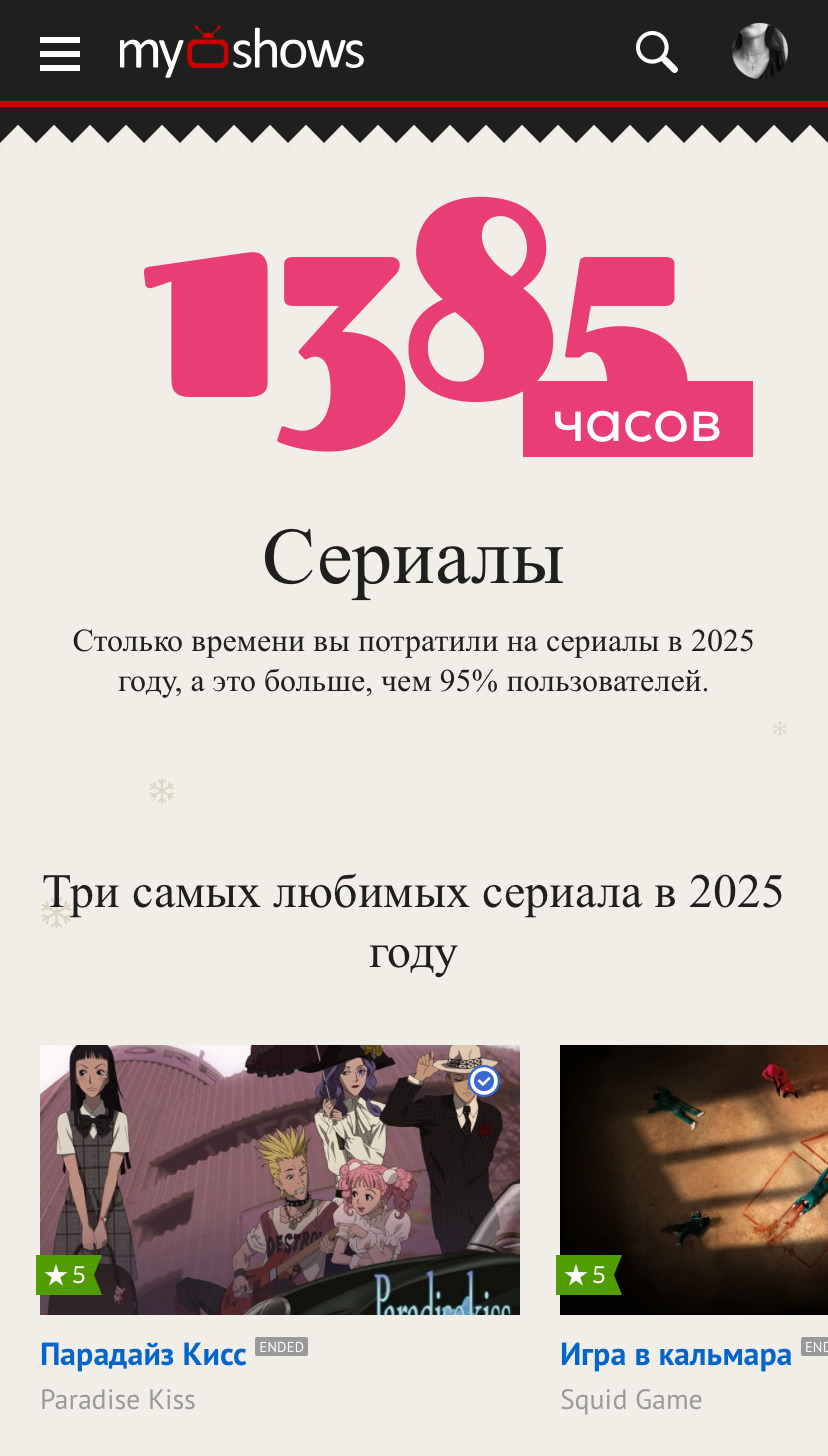 Интересные итоги года, как личные, так и MyShows. Поздравляю с наступающим Новым годом всю команду МШ и желаю вам не сбавлять темпы развития проекта, несмотря на сложности. А мы, ваши пользователи, будем поддерживать вас 🧡