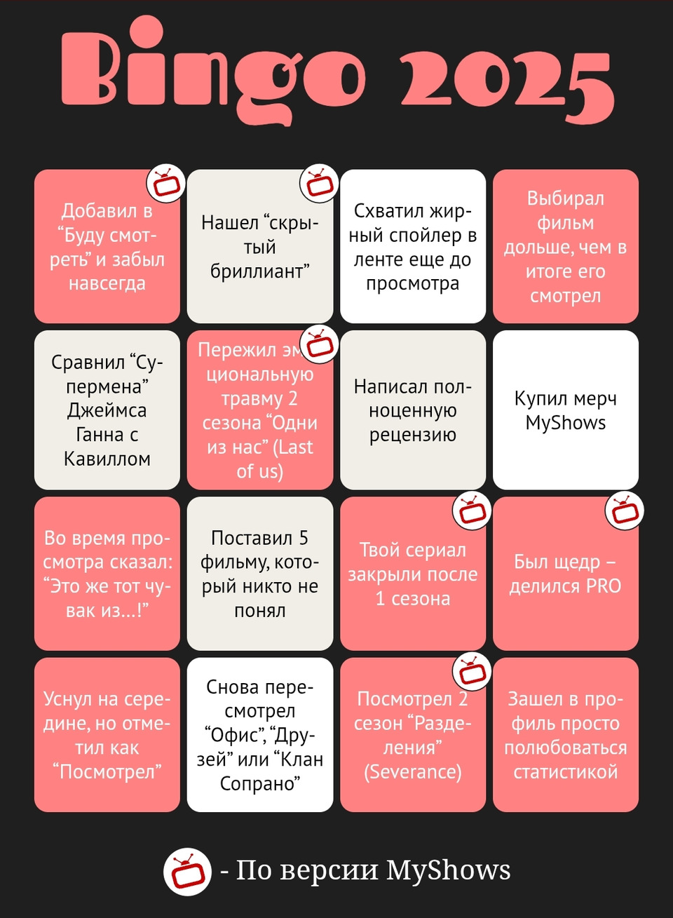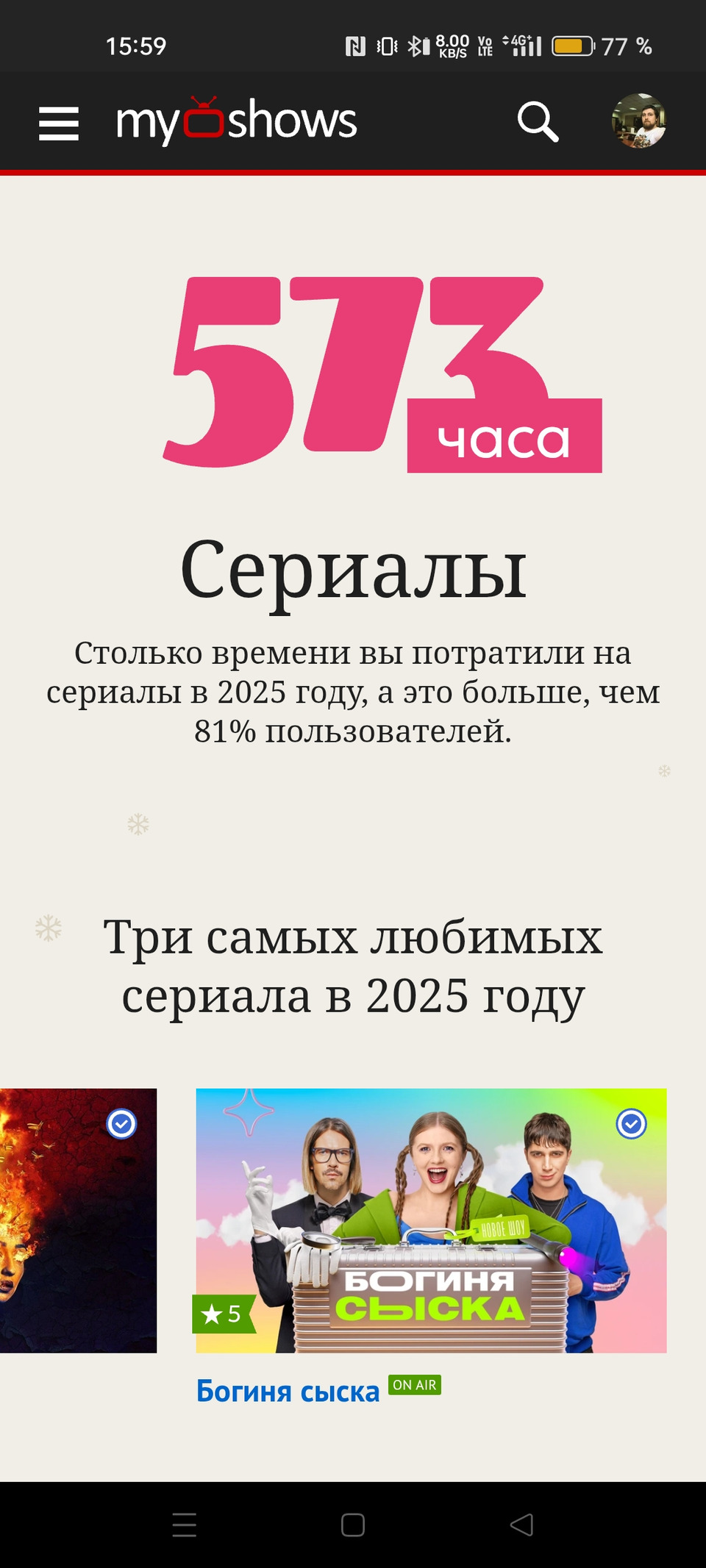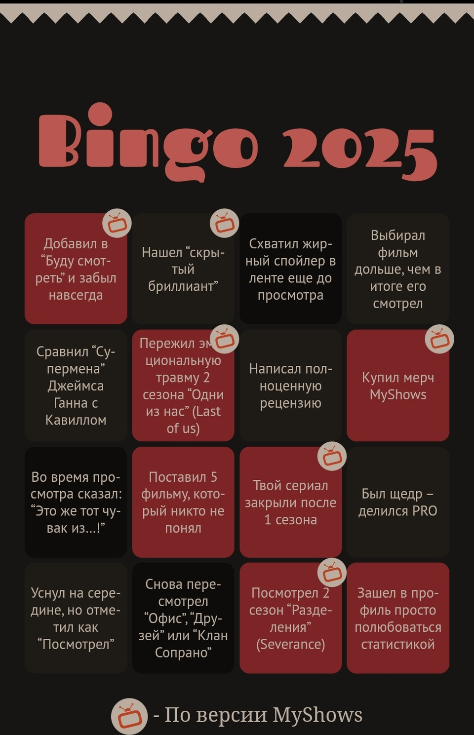 Интересные итоги года, как личные, так и MyShows. Поздравляю с наступающим Новым годом всю команду МШ и желаю вам не сбавлять темпы развития проекта, несмотря на сложности. А мы, ваши пользователи, будем поддерживать вас 🧡
