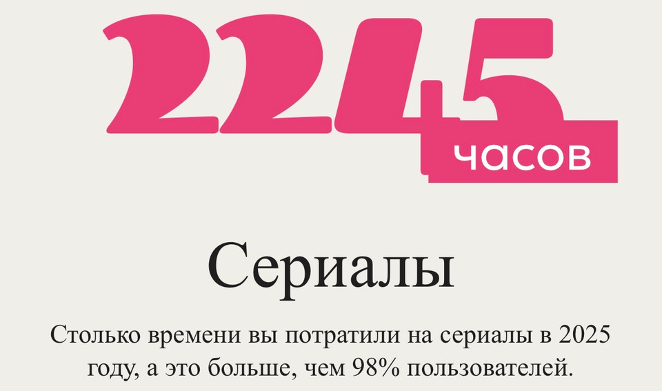 Интересно было посмотреть свою годовую статистику, но было бы здорово в разделе "Полная статистика" видеть динамически обновляющуюся статистику (после каждой отметки просмотра) в виде графиков за всё время — чтобы наглядно было видно, как менялось потраченное время на просмотр сериалов, какие изменения происходили в предпочитаемых жанрах и тп.