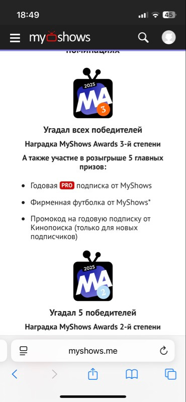 В этом году голосование опять проходит вместе с «Кинопоиском». Поэтому победители вместе с призами от MyShows получат индивидуальные промокоды на подписку «Кинопоиска»! |