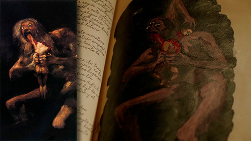Интересно, что рисунок Куэгле в книге - это переделанный "Сатурн, пожирающий своего сына" Гойи, вроде, не замечала такого в сериале раньше, а это прикольно :) Можно на минутку представить себе, что Гойя тоже был Гриммом, это объяснило бы его "мрачные картины" :)