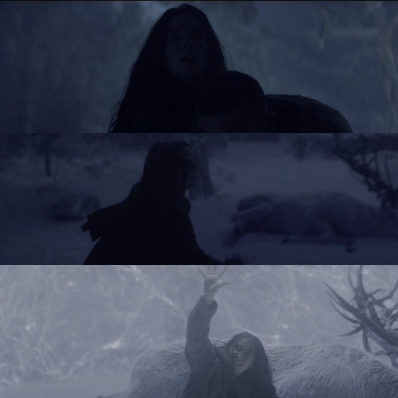 Дарклинг во флэшбеке куда интереснее, чем сейчас. С диалогами прямо беда, что у Алины с Женей, что у Алины с Дарклингом - ощущение, словно Алина телепат. Нигде вроде в сериале про сложности Жени с царем не говорилось, а Алина прям догадалась и решила, что да, можно мстить. Сцена с оленем красивая и жуткая одновременно. И эти рога из ключиц - бррр. Как Женя ее обнимала и не напоролась на них?)))))))))