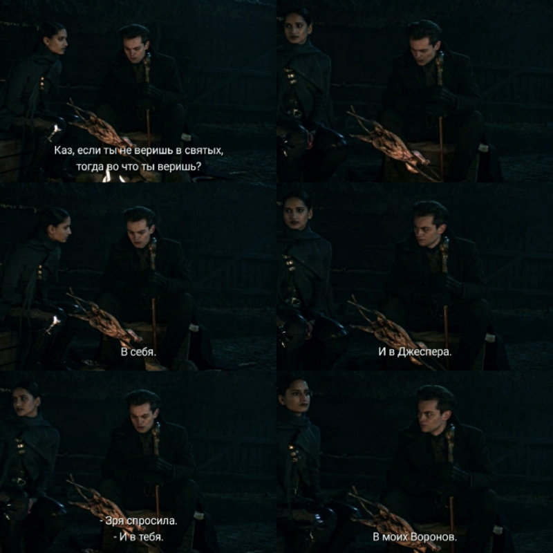 Такие трогательные диалоги в начале серии между Инеж с Джеспером, а потом с Казом. У них потрясающая химия и динамика друг с другом. Шутки, взгляды, разговоры. Не терпится уже увидеть всех воронов вместе💔 Джеспер - само очарование!