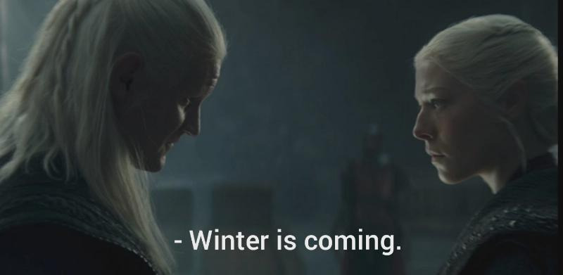 И это финал, а у нас еще есть Деймон, который весь сезон в Харренхоле (сравните с Деймоном из 1 сезона), Рейнира, которая почти весь сезон за столом провела и все еще сомневается что делать, да и с другими персонажами мало чего происходит. Еще и это идиотское пророчество про зиму, которое вставляют постоянно, совсем надоело.
