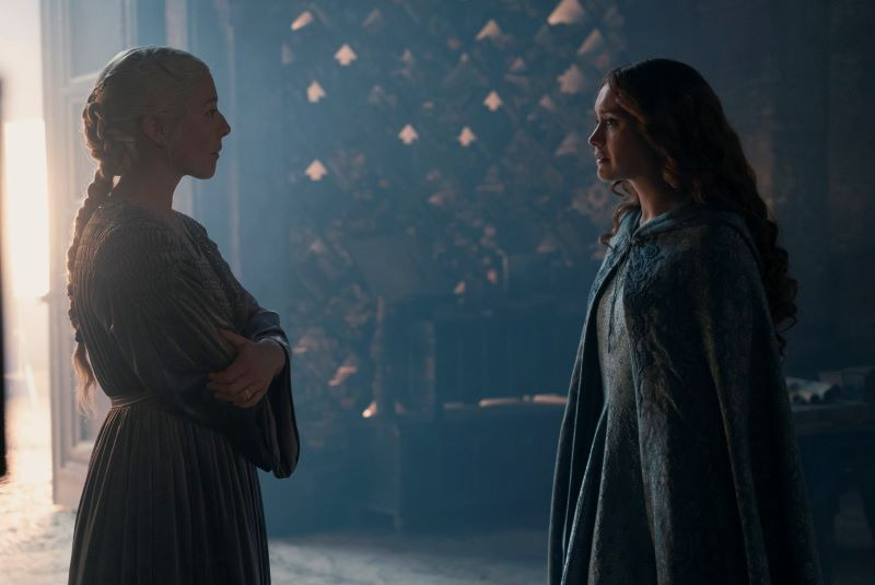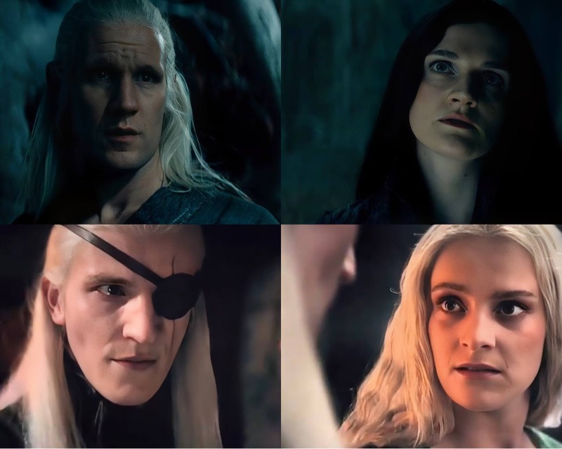 Остаётся вопрос, конечно, насколько Алисента искренна. Её ретрит в прошлой серии явно показывает усталость от всего и желание освободиться от груза забот короны, так что вроде как говорит правду. Однако прямо во время её обещания сдать Рейнире столицу и короля Эйегон уезжает из города вместе с Ларисом. Очень своевременно. Это может быть и совпадением, но кажется мне, что всё-таки это их общий план, Лариса и Алисенты. В подтверждение тому ещё тот факт, что Алисента выбралась из города, несмотря на приказ Эйемонда досматривать все выходящие корабли. В одиночку ей это было бы сложно, но мастер над шептунами мог бы это обеспечить.