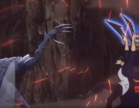 И вот сразу после прокачки владения кинжалом ДжинУ и рубит муравья на куски. В том числе разлетаются в клочья его крылья и рука. Муравей бежит, параллельно сначала регенерирует свою нашинкованную руку, а сразу следом крылья (тот самый момент, который вы заметили).
